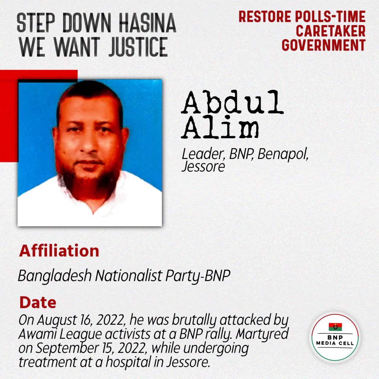 On August 16, 2022, he was brutally attacked by Awami League activists at a BNP rally. Martyred on September 15, 2022, while undergoing treatment at a hospital in Jessore.
