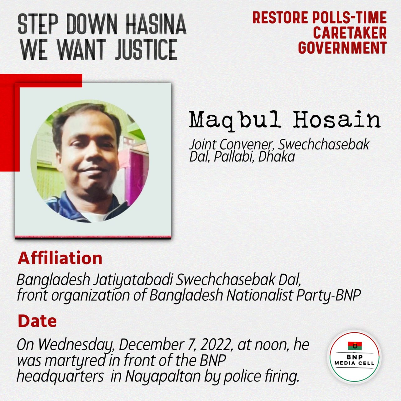 On Wednesday, December 7, 2022, at noon, he was martyred in front of the BNP headquarters in Nayapaltan by police firing.