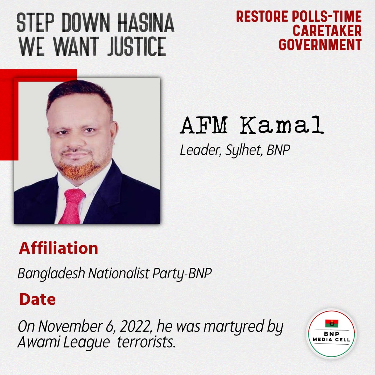 On November 6, 2022, he was martyred by Awami League terrorists.