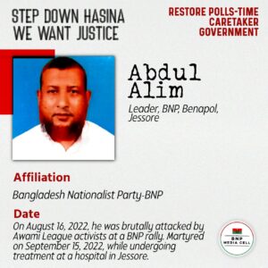 Abdul Alim Leader, BNP, Benapol, Jessore Affiliation Bangladesh Nationalist Party-BNP On August 16, 2022, he was brutally attacked by Awami League activists at a BNP rally. Martyred on September 15, […]