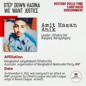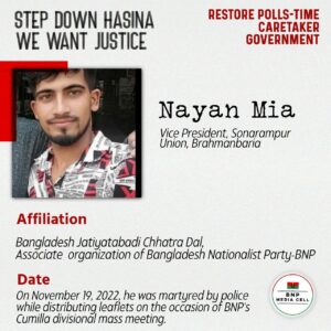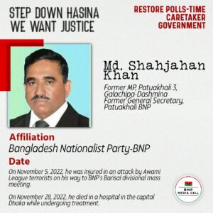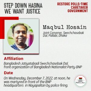 Maqbul Hosain Joint Convener, Swechchasebak Dal, Pallabi, Dhaka Affiliation Bangladesh Jatiyatabadi Swechchasebak Dal, front organization of Bangladesh Nationalist Party-BNP On Wednesday, December 7, 2022, at noon, he was martyred in […]