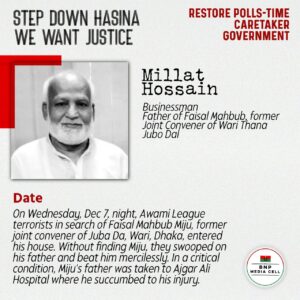 Millat Hossain Businessman Father of Faisal Mahbub, former Joint Convener of Wari Thana Jubo Dal On Wednesday, Dec 7, night, Awami League terrorists in search of Faisal Mahbub Miju, former […]
