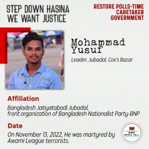 Mohammad Yusuf Leader, Jubadal, Cox’s Bazar Affiliation Bangladesh Jatiyatabadi Jubadal, front organization of Bangladesh Nationalist Party-BNP On November 13, 2022, He was martyred by Awami League terrorists.