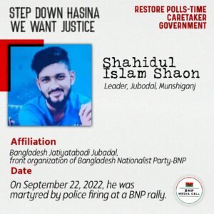 Shahidul Islam Shaon Leader, Jubodal, Munshiganj On September 22, 2022, he was martyred by police firing at a BNP rally. Affiliation Bangladesh Jatiyatabadi Jubadal, front organization of Bangladesh Nationalist Party-BNP