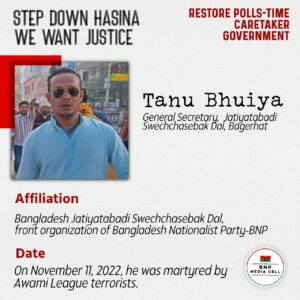 Tanu Bhuiya General Secretary, Jatiyatabadi Swechchasebak Dal, Bagerhat Affiliation Bangladesh Jatiyatabadi Swechchasebak Dal, front organization of Bangladesh Nationalist Party-BNP On November 11, 2022, he was martyred by Awami League terrorists.