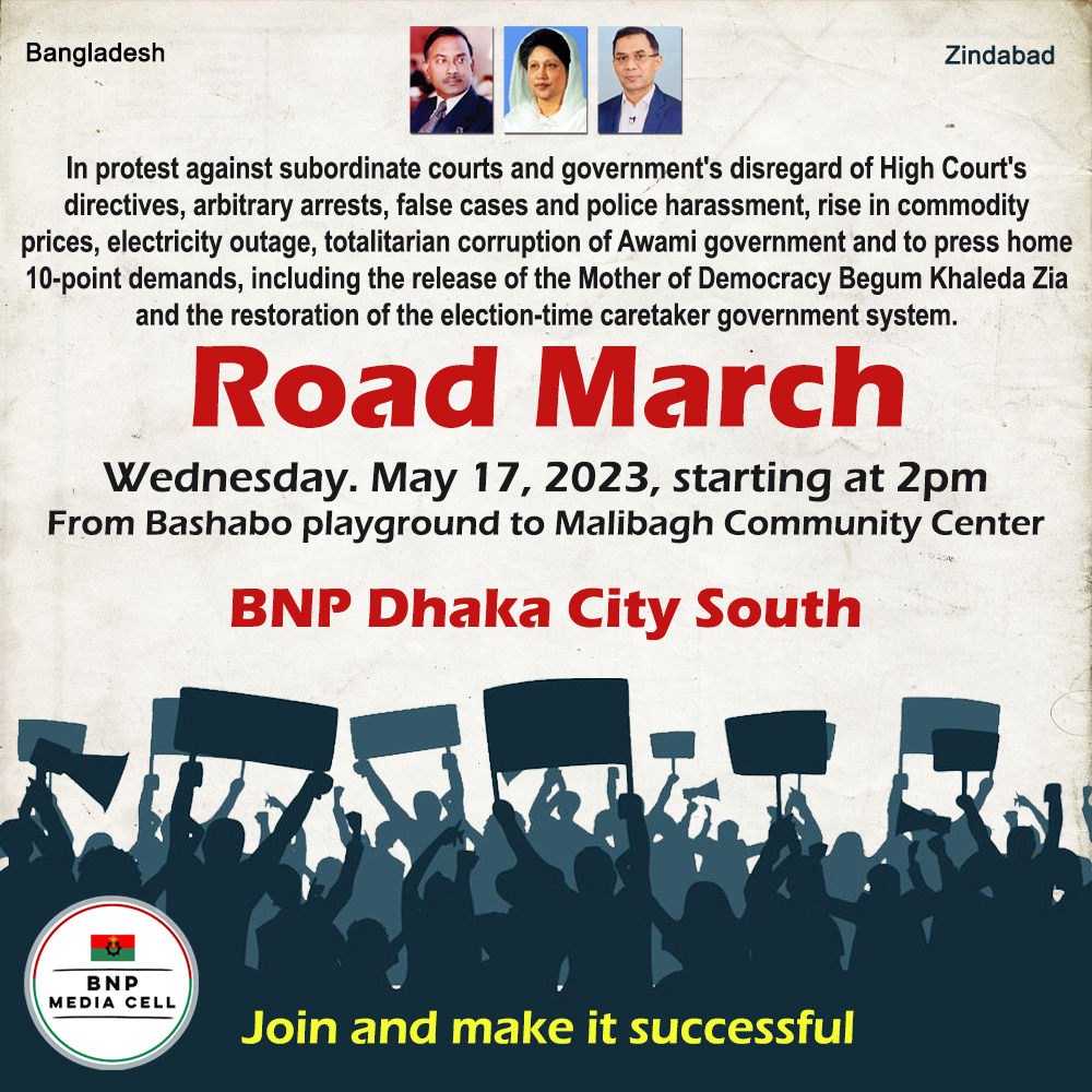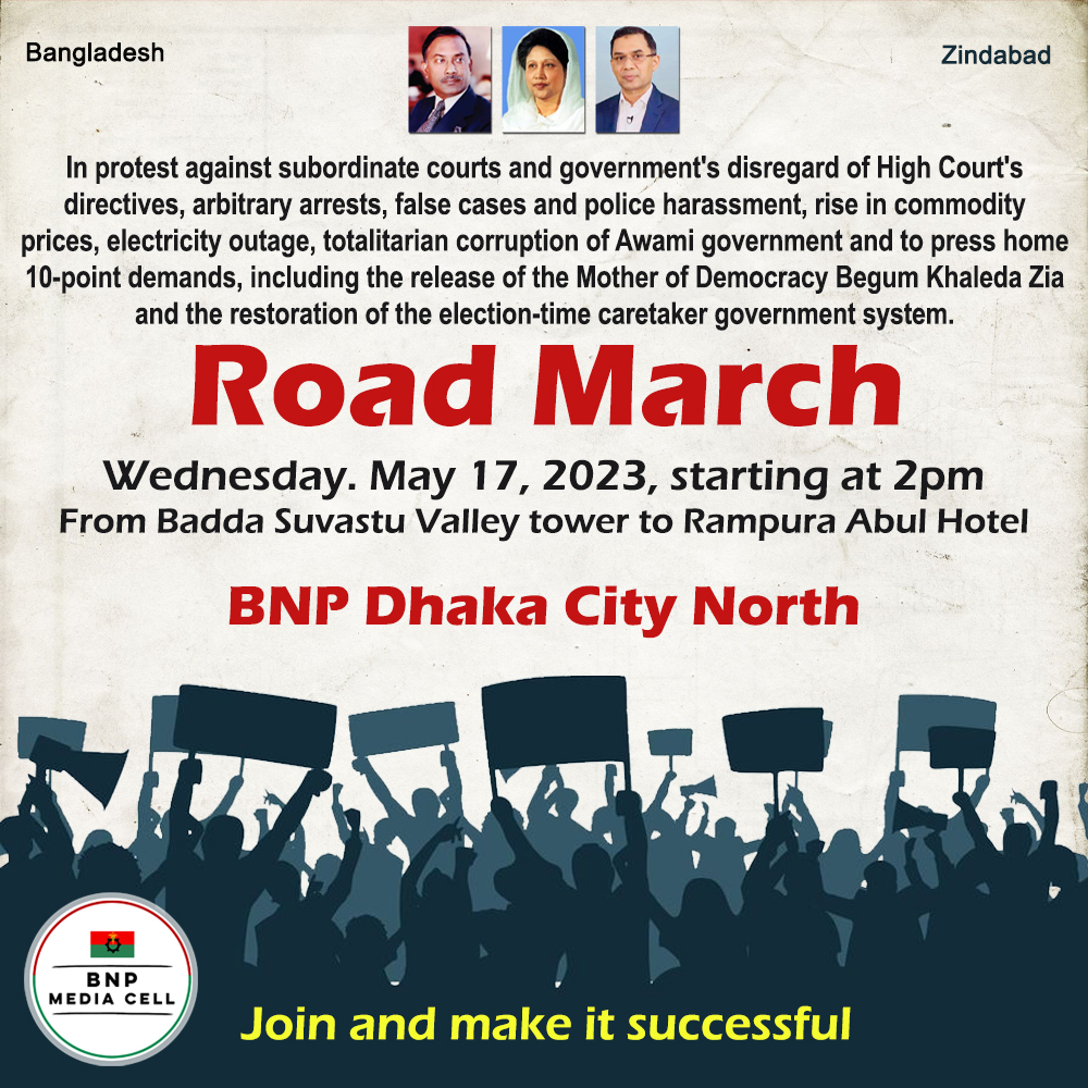 Badda, Suvastu Valley to Rampura Abul HotelIn protest against subordinate courts and government's disregard of High Court's directives, arbitrary arrests, false cases and police harassment, rise in commodity prices, electricity outage, totalitarian corruption of Awami government and to press home 10-point demands, including the release of the Mother of Democracy Begum Khaleda Zia and the restoration of the election-time caretaker government […]