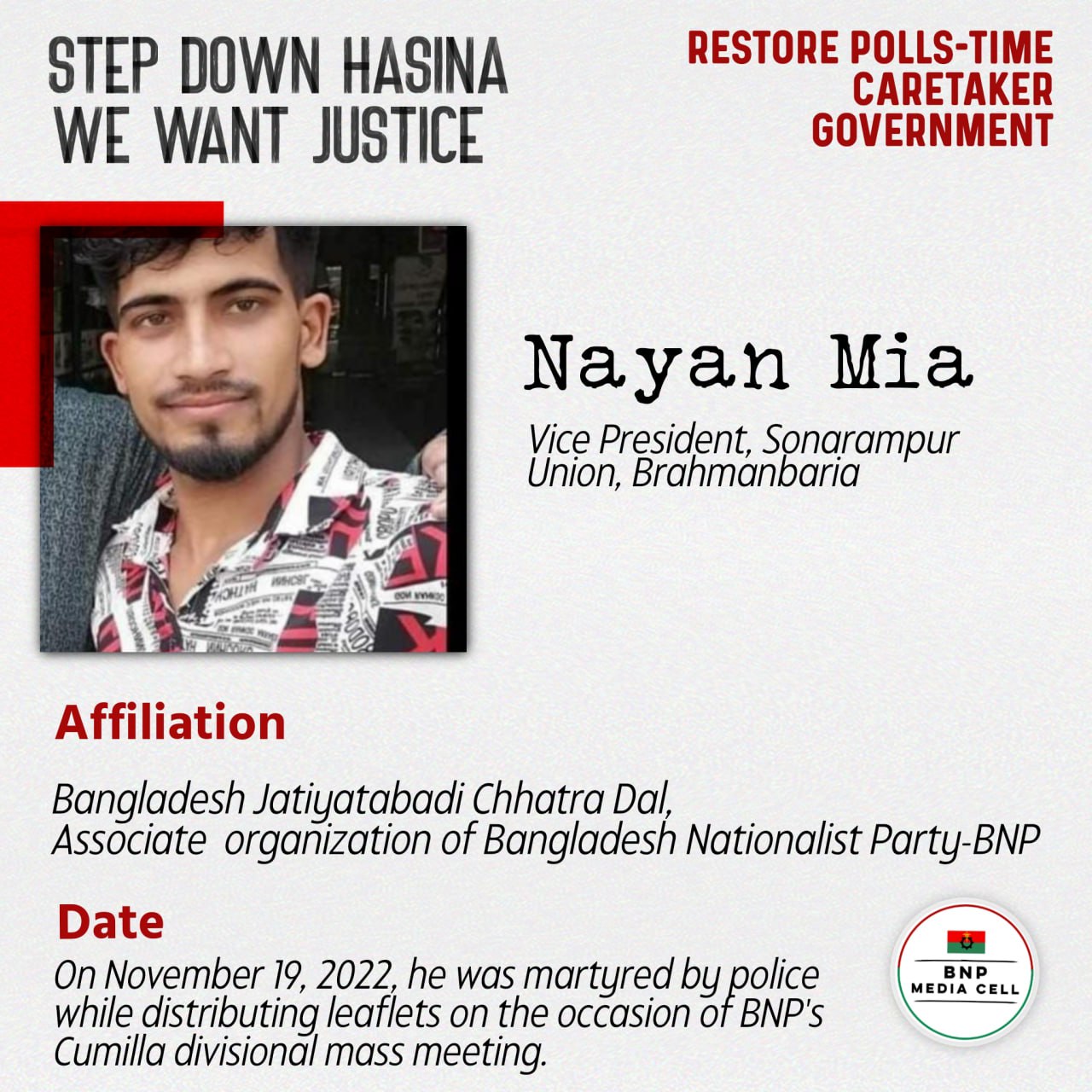 On November 19, 2022, he was martyred by police while distributing leaflets on the occasion of BNP’s Cumilla divisional mass meeting.