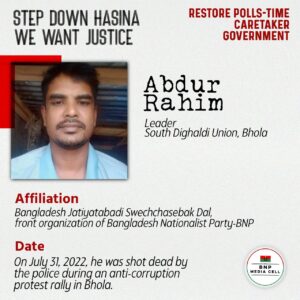 Leader, South Dighaldi Union, Bhola Affiliation Bangladesh Jatiyatabadi Swechchasebak Dal, front organization of Bangladesh Nationalist Party-BNP Date On July 31, 2022, he was shot dead by the police during an […]