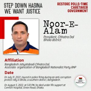 Noor-e Alam President, Chhatra Dal Bhola district Affiliation Bangladesh Jatiyatabadi Chhatra Dal, Associate organization of Bangladesh Nationalist Party-BNP On July 31, 2022, injured in police firing during an anti-corruption protest […]