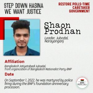 Shahidul Islam Shaon Leader, Jubodal, Munshiganj On September 22, 2022, he was martyred by police firing at a BNP rally. Affiliation Bangladesh Jatiyatabadi Jubadal, front organization of Bangladesh Nationalist Party-BNP
